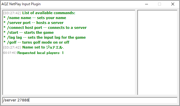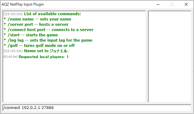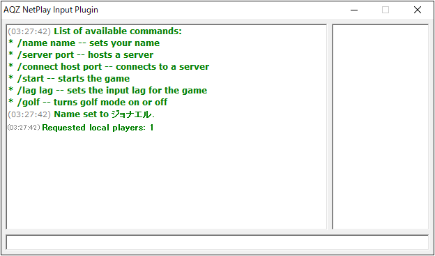 インプットプラグインに「AQZ NetPlay v0.20」が設定されている状態でロムを起動すると、オンラインプレイ用のコンソールが表示されます。