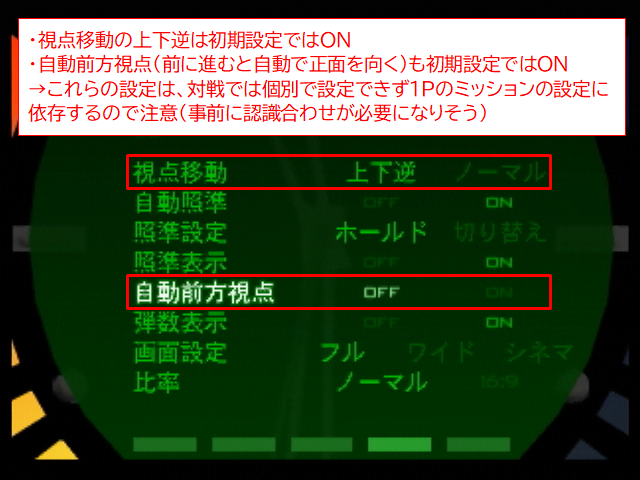 ただし、このオプションはミッションにしかなく、N64版ではミッションの設定が対戦でも引き継がれ、プレイヤー全員共通の設定となります。