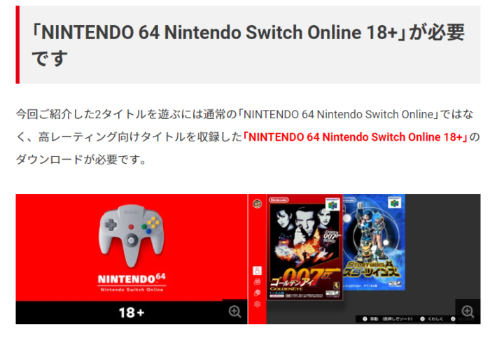 任天堂の公式記事によると、高レーティング向けタイトルを収録した「NINTENDO 64 Nintendo Switch Online 18+」のダウンロードが必要とのことです。